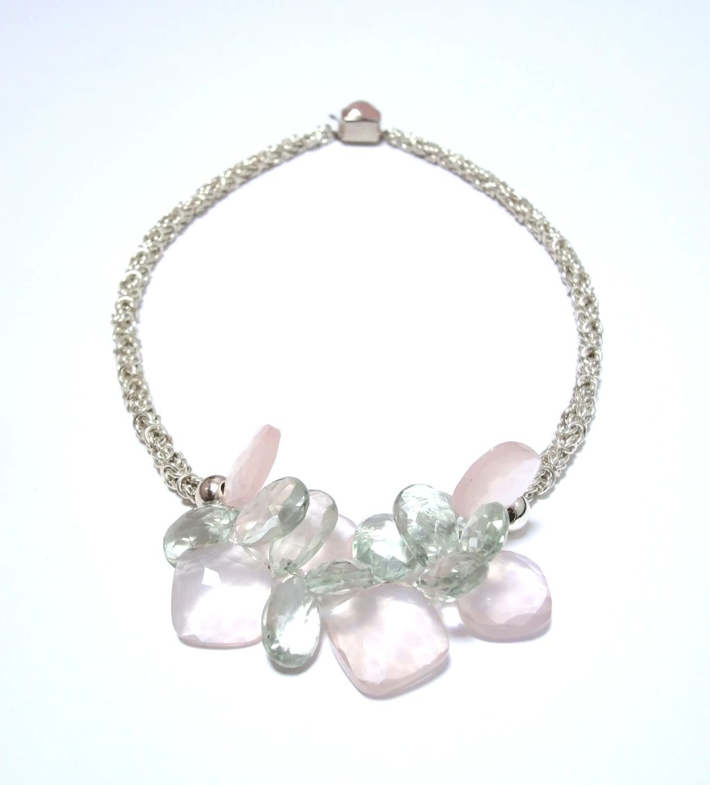 Rose quartz and green amethyst with handmade silver chainmaille and a rose quartz silver box clasp. $300.00